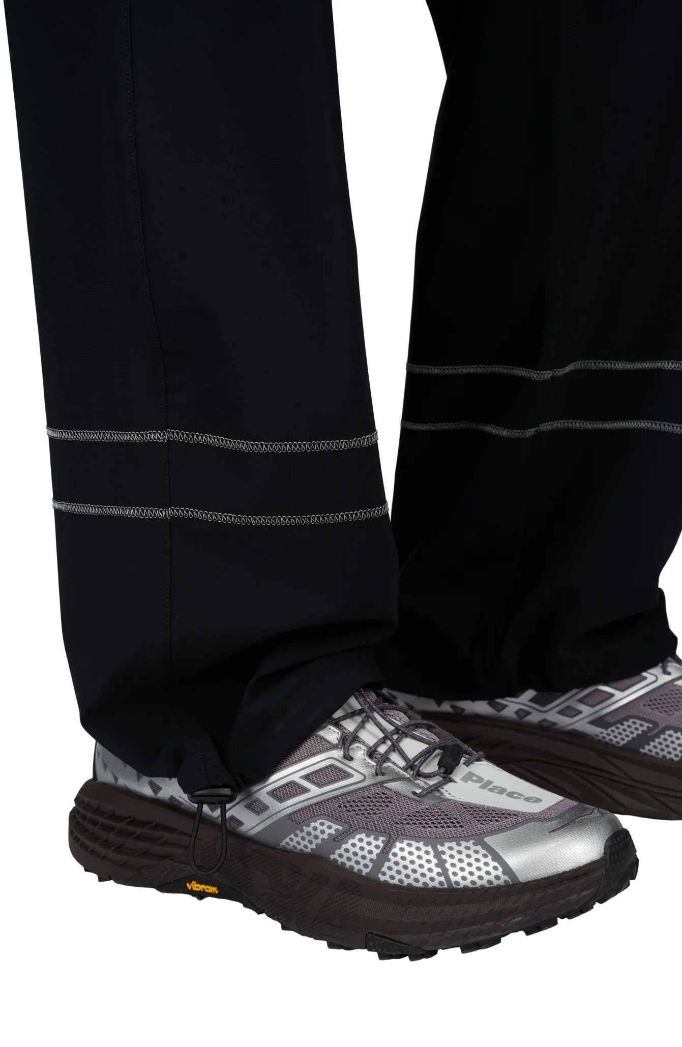 Wide running pants in Black with a soft stretch, two front pockets and a smart hidden pocket to keep your phone in place. Two reflective contrast seams around the bottom of each leg. Elasticated waist and hem with cord stoppers. Made in Econyl.