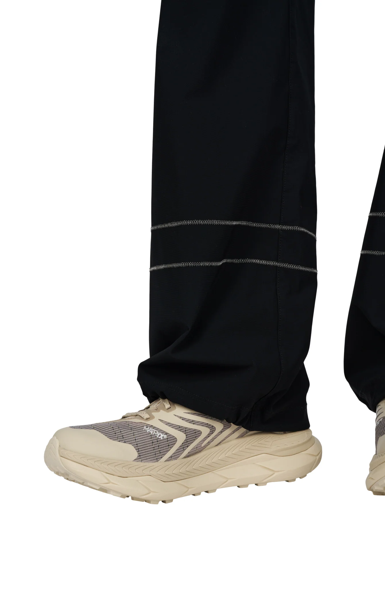 Wide running pants in Black with a soft stretch, two front pockets and a smart hidden pocket to keep your phone in place. Two reflective contrast seams around the bottom of each leg. Elasticated waist and hem with cord stoppers. Made in Econyl.