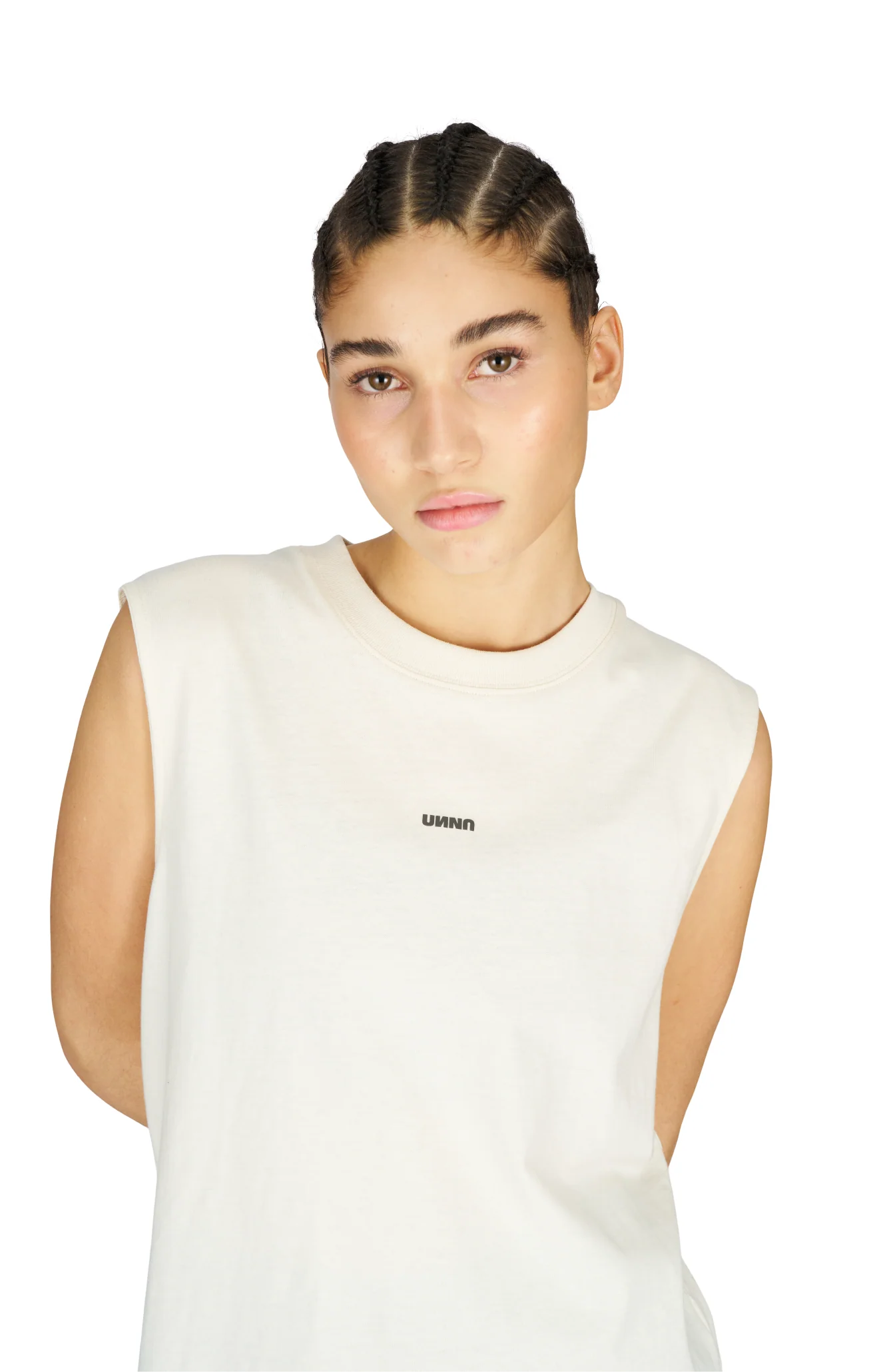 Women's sleveless tanktop in Vanilla White with a regular fit. Made in an Organic Cotton & Recycled Polyester blend with a reflective transfer print UNNA logo in the front and reflective "Finish in a Good Place" slogan in the back.